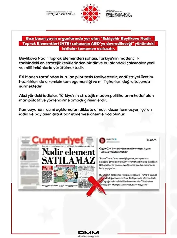Sosyal medyada yer alan “Eskişehir Beylikova Nadir Toprak Elementleri sahası ABD’ye devredildi” iddiasına İletişim Başkanlığı’ndan yalanlama geldi.