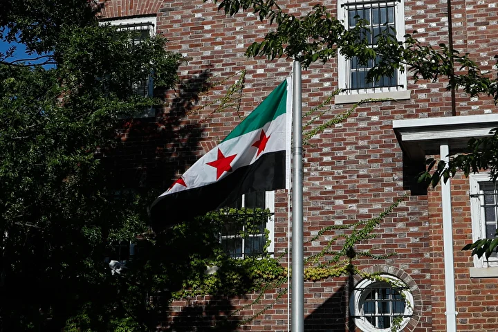 Washington’da 18 Mart 2014’te kapatılan büyükelçilik binasında, ​​​​​​​Suriye Dışişleri Bakanı Esad Hasan Şeybani, Suriye Arap Cumhuriyeti bayrağını göndere çekti.
