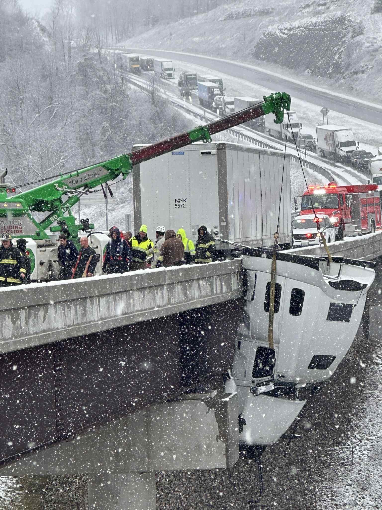 Sürücü kabinin içinde, yaklaşık 5 saat boyunca boşlukta asılı halde kaldı. Olay yerine kar yağışı nedeniyle saatler sonra gelen ekipler sürücünün şaşırtıcı biçimde yaralanmadığını söyledi.