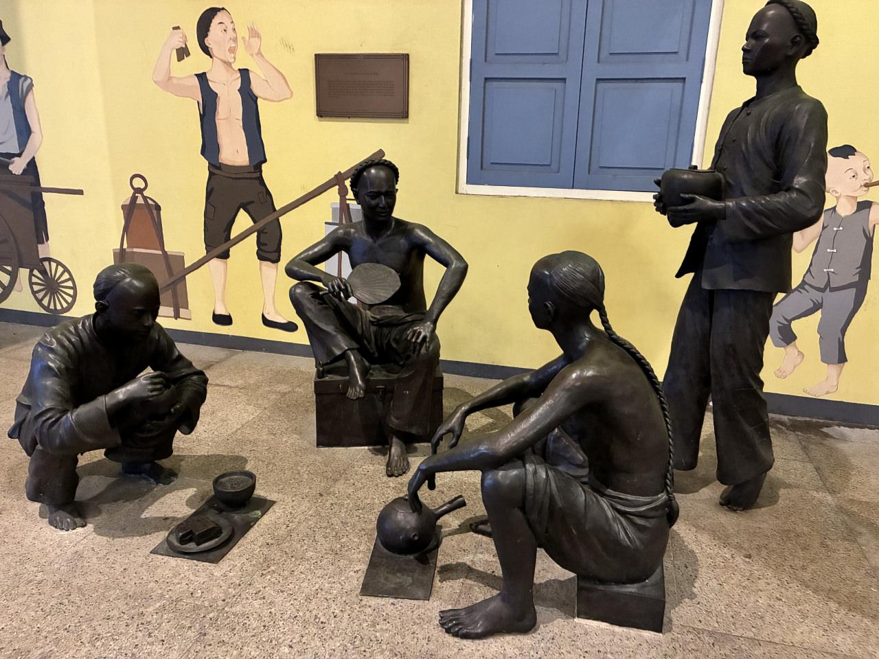 Şehir merkezinde yer alan bronz heykel grupları, Singapur’un erken dönem göçmen toplumlarını temsil eden kültürel bir anlatı.